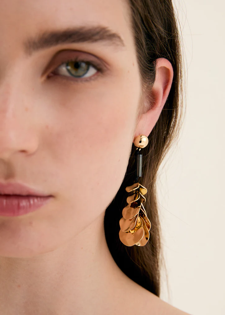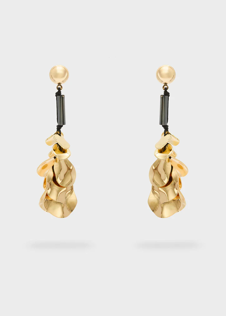 Orecchini pendenti con lavorazione irregolare e dettagli metallici lucidi, un modello scultoreo e sofisticato che cattura la luce con eleganza.