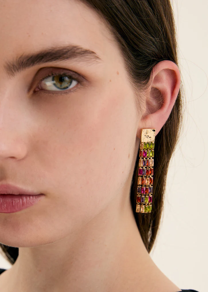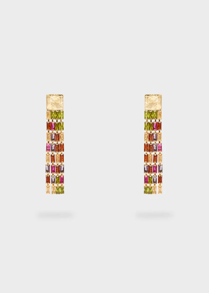 Orecchini a barretta con baguette multicolor a cascata, un modello vivace e raffinato che regala energia e stile.